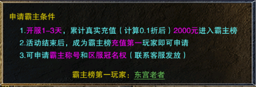 1、开服1-3天活动时间内,累计真实充值(计算0.1折后)2000元进入霸主榜