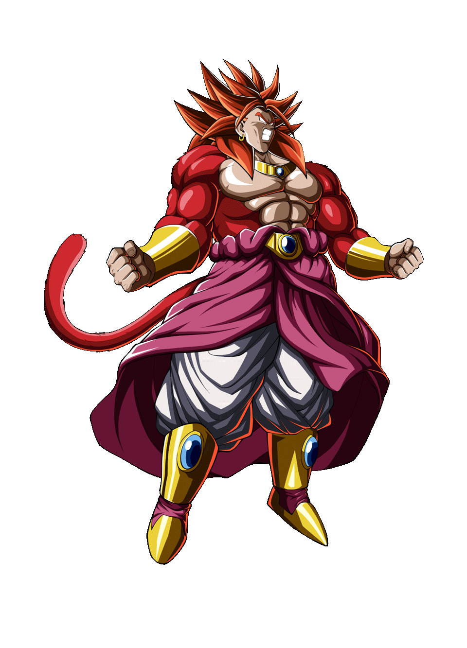 黑烟神龙为了对抗孙悟空与贝吉塔等人,使用负面能量将已成为传说超级赛亚人3的布罗利先变为黄金巨猿,再辅助其化为人形,所变身成的形态。和普通超4不同,布罗利的超4与他的传超特征相似,更大、更强壮的身体(并长出尾巴),黑色的长发披在肩膀上但更凌乱。他的体毛是血红色。在超4的基础上红色的神气息加持,发色变为外红内黑,金色气焰变为紫红色,战斗力能媲美超四贝吉特与超蓝贝吉特的联手。